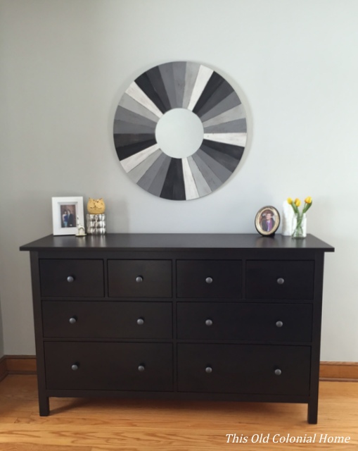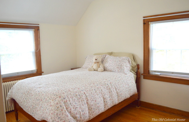 The furniture remained a hodgepodge of pieces that didn’t go together. I had bought a yellow nightstand at a garage sale for $5 that I loved. The original thought was to add another yellow nightstand on the other side of the bed, but as usual I eventually changed my mind. So the room remained in a state of mismatchedness. (Is that even a real word?!)