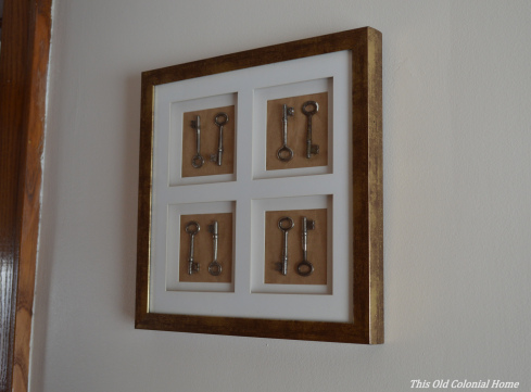 The flower picture is actually glued to the backing, so I had to cover it since the keys were going to be displayed in each square window. I wanted a vintage feel to it, so I simply cut up a brown paper bag and taped it around the backing sort of like a present.